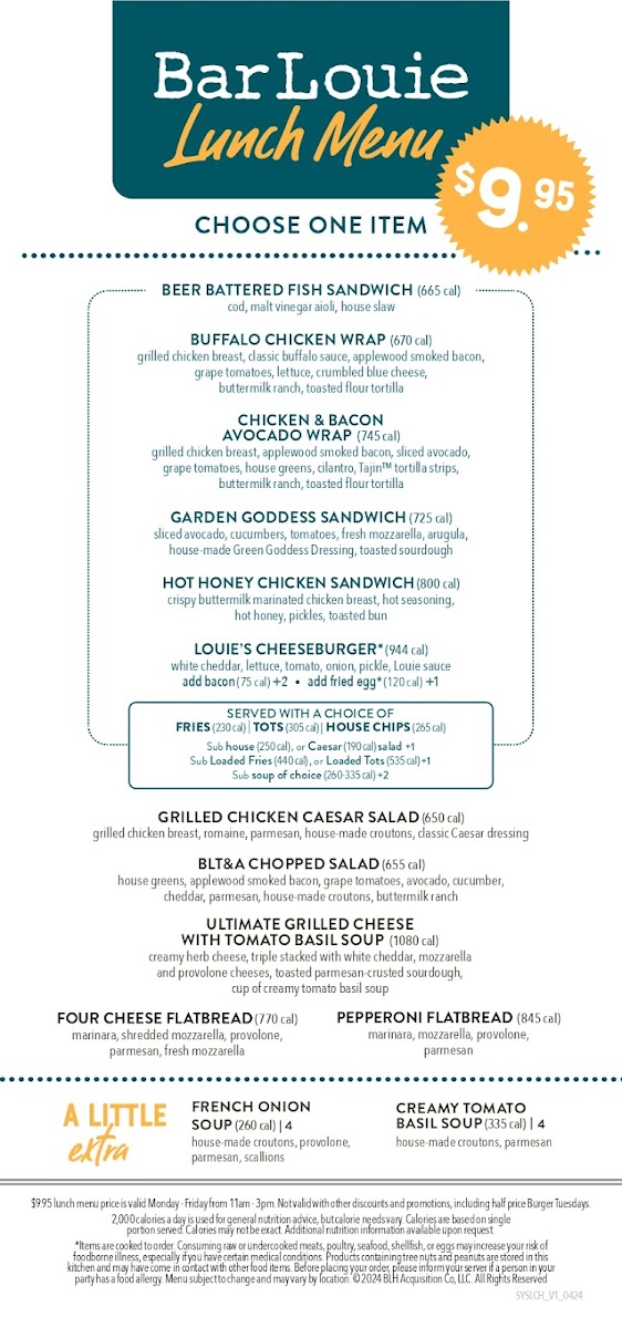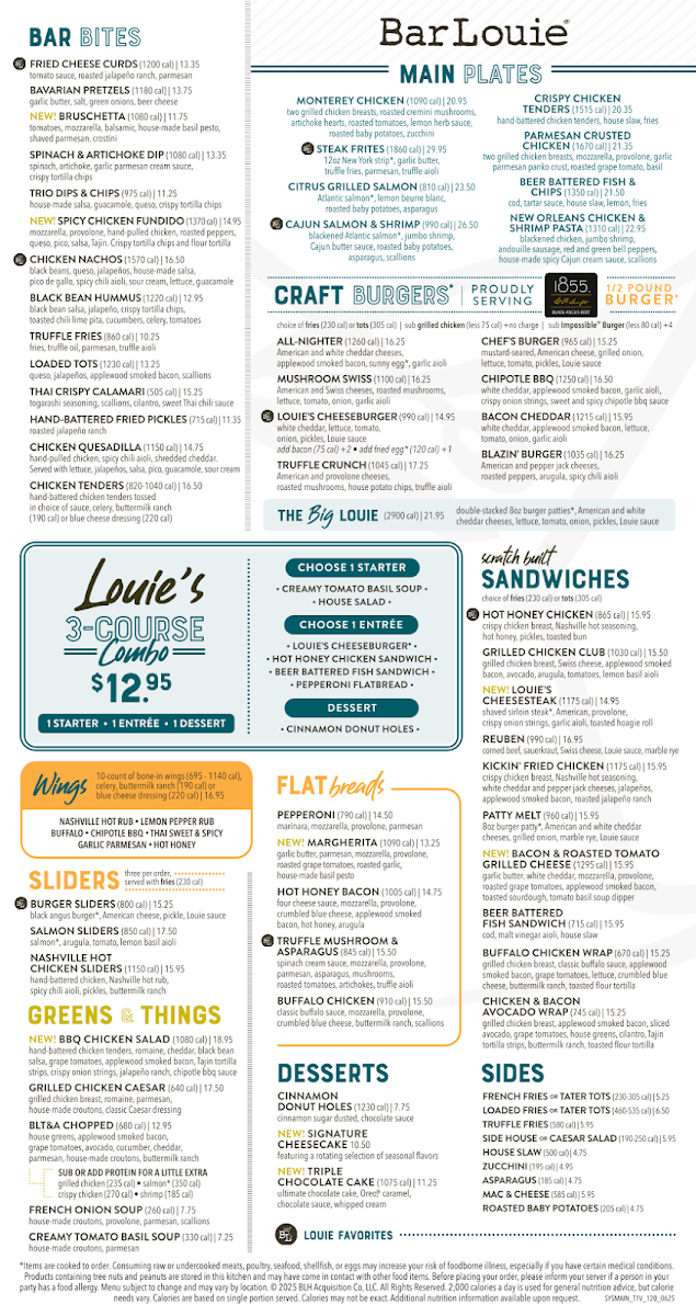 double-stacked 8oz burger patties*, American and white cheddar cheeses, lettuce, tomato, onion, pickles, Louie sauce, choice of fries or tots. Includes choice of starter and dessert.